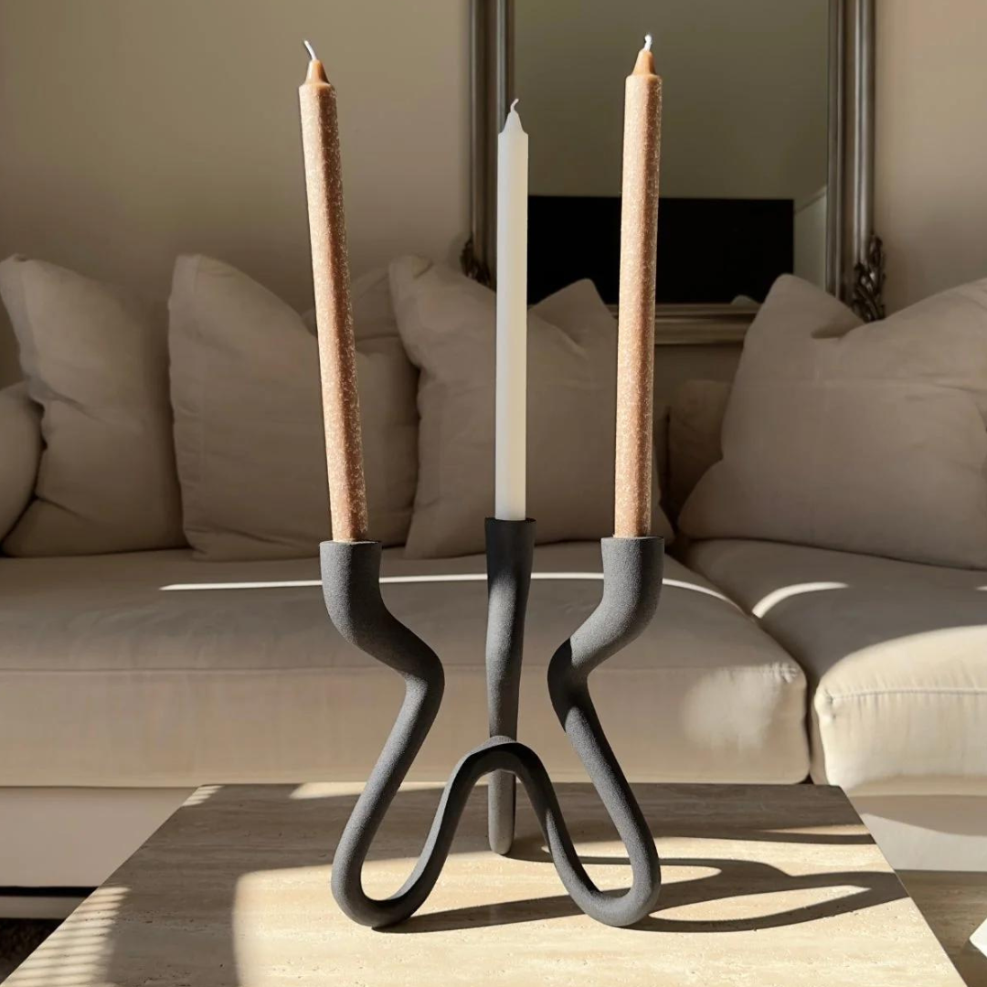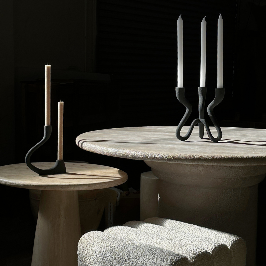 Introducing the Ebony Collection, where modern sophistication seamlessly intertwines with artistic edge to create a symphony of design and craftsmanship. These captivating candelabras, meticulously crafted from black textured aluminum, stand as a testament to the harmonious blend of contemporary aesthetics and timeless artistry. With their elegantly curved figures and sculptural presence, they evoke a sense of intrigue and sophistication, adding a layer of depth and character to any space they grace.