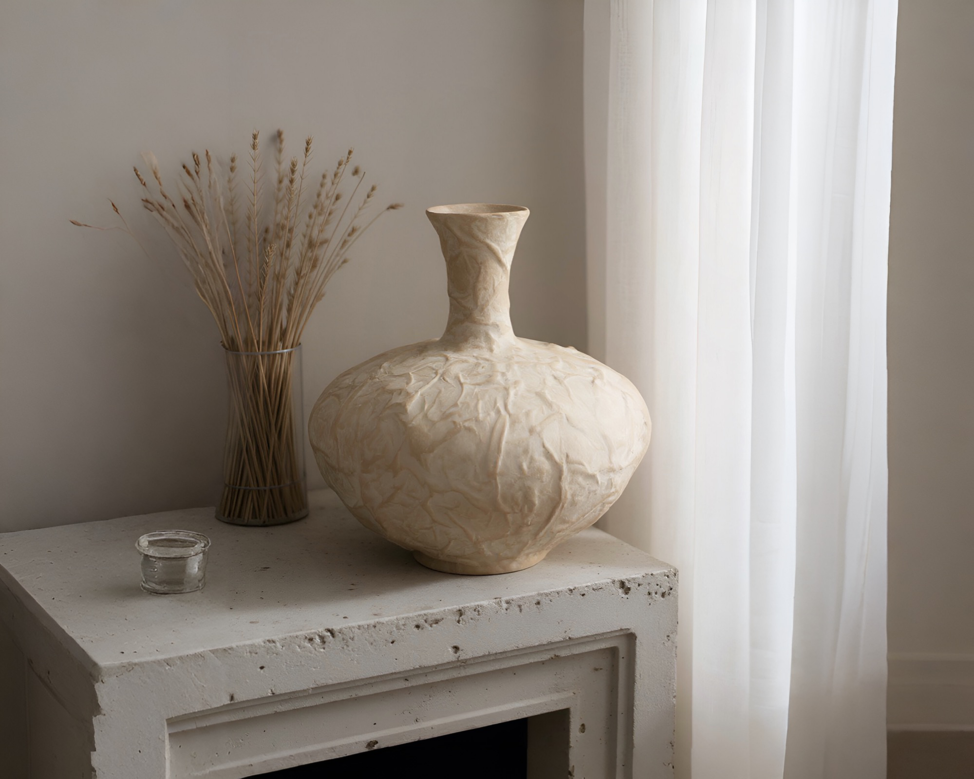 Inspirado en el arte de arrugar materiales para crear formas y texturas, los artesanos aplican detalles de envejecido a mano en las secciones elevadas de los jarrones Cima, creando un profundo contraste. Su gran tamaño atrae la atención, ya sea exhibidos individualmente o en grupos, convirtiéndolos en piezas de declaración perfectas. Fabricados con Ecomix, un material biodegradable y ecológico.